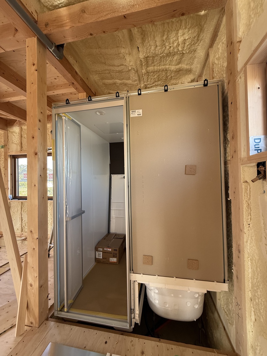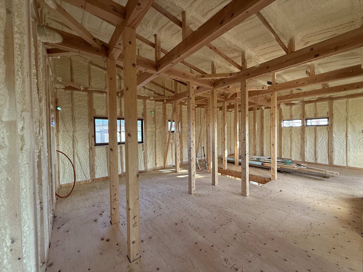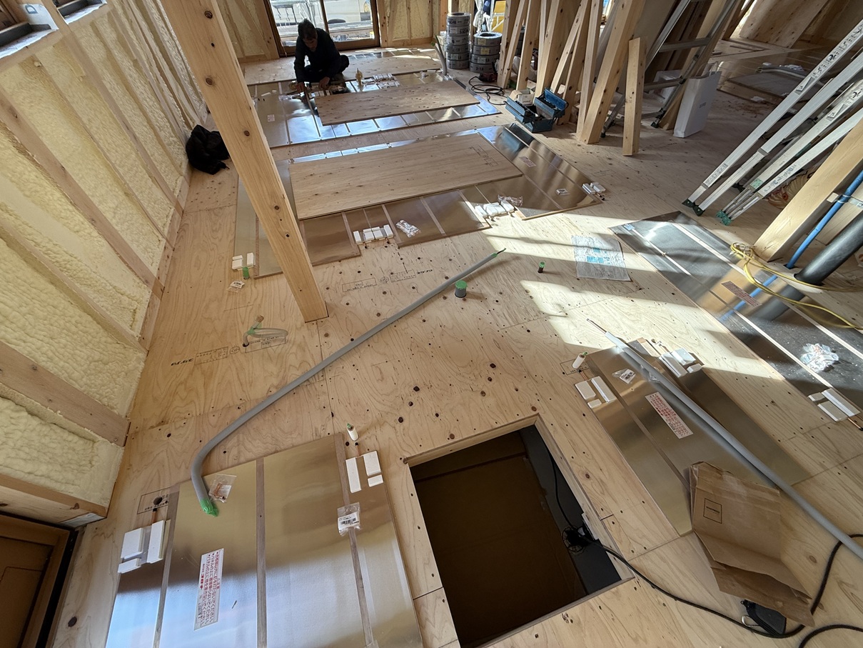 室内の方は先日、発泡ウレタン吹付施工・ユニットバス据付・床暖パネル敷きまで無事完了しました。