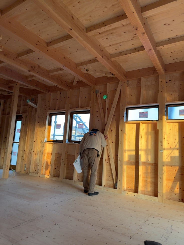 室内の方は先日、建物中間検査(耐震等級3)の方をハウスプラス保険員さん立会いのもと行いました。