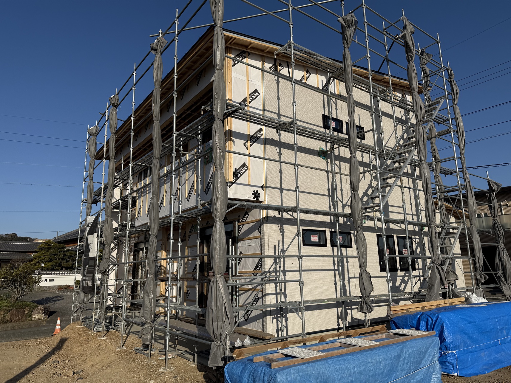 今現在K様邸現場状況の方はというと、屋外の方は外壁工事中です。