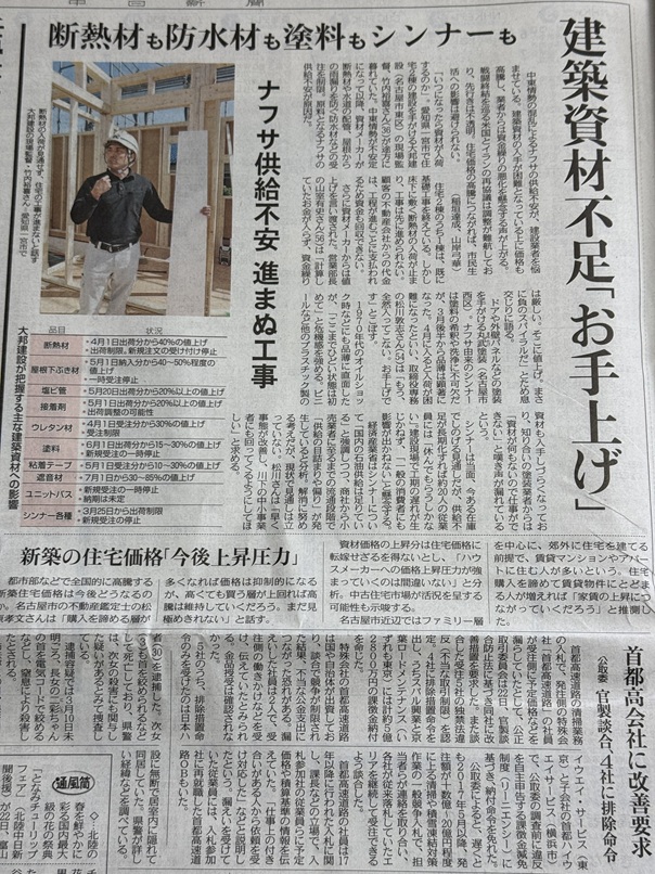 最近の原料不足による諸々の製品が品薄でそれに伴い納期未定のものや大幅な値上げ通達など住宅環境は混沌としています。