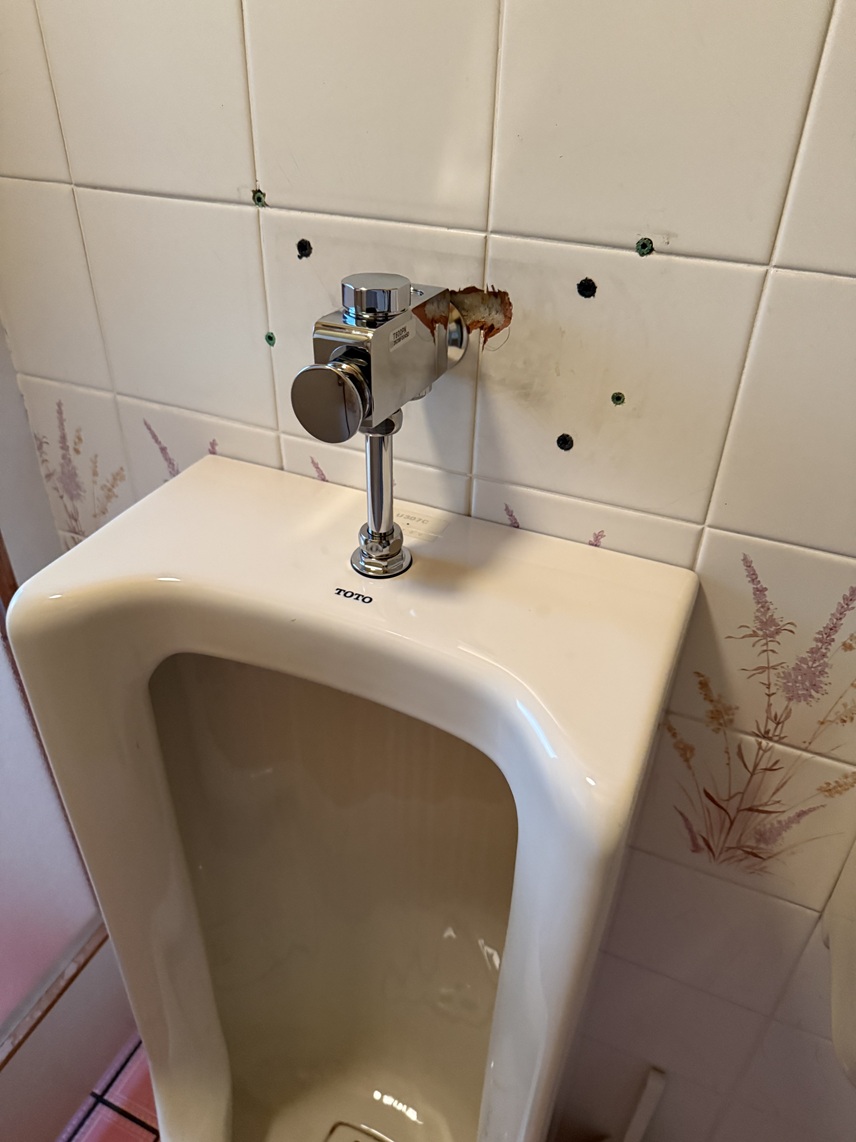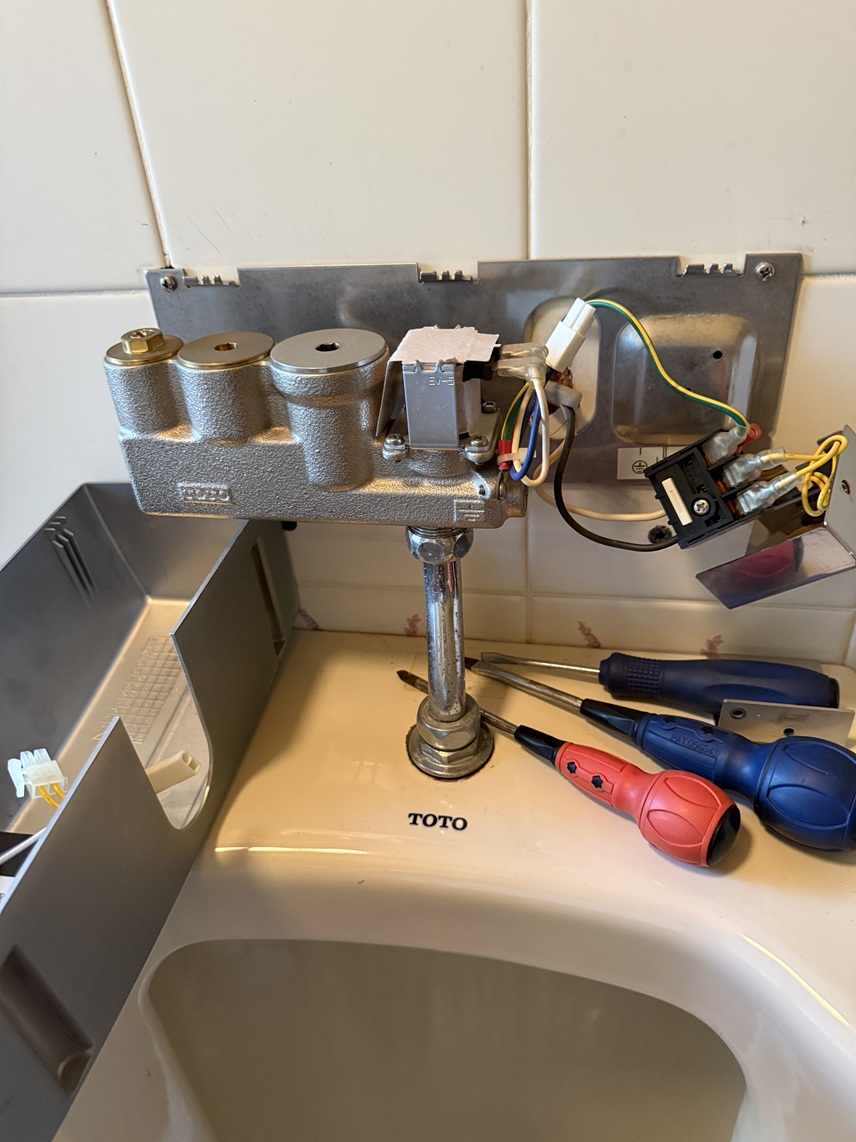 F様邸母屋小便器センサー経年劣化故障に伴う押しボタン式への取替え